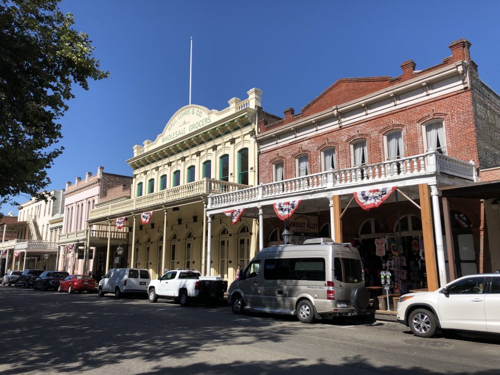 Nous faisons quelques arrêts: Bear Valley village, Angel’s camp. Le premier a pour effigie l’ours et le second c’est la grenouille! Nous n’avons croisé aucun de ces deux animaux, on se tenait prêt pourtant! A Angel’s camp, nous entrons dans un petit restaurant (le seul ouvert priori) pour se rafraîchir et pas le temps de s’asseoir que nous nous faisons servir eau avec glace, chips & dips. Bien lancés, nous commandons en plus de l’avocat frit et un guacamole; on ressort de là avec 3kg de plus et gavé jusqu’au soir. Les tenanciers sont très sympa et nous parlons de voyage, des langues parlées en Suisse. Amusant, si nous ne précisons pas notre provenance, les américains nous collent l’étiquette « français ». Nous nous attelons à préciser directement « of Swtzerland, the french part » et ainsi commence une conversation!